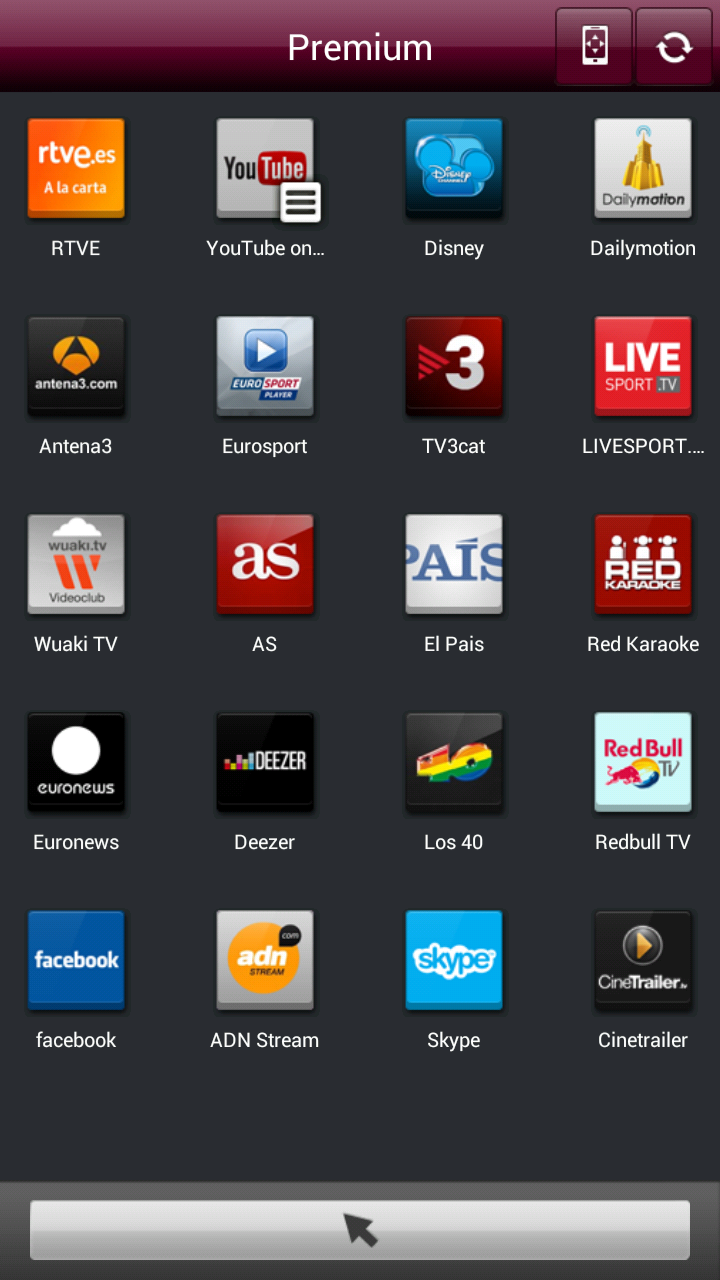 - Vídeos bajo demanda: YouTube, DailyMotion, ADN Stream, Cine Trailer y Wuaki.tv