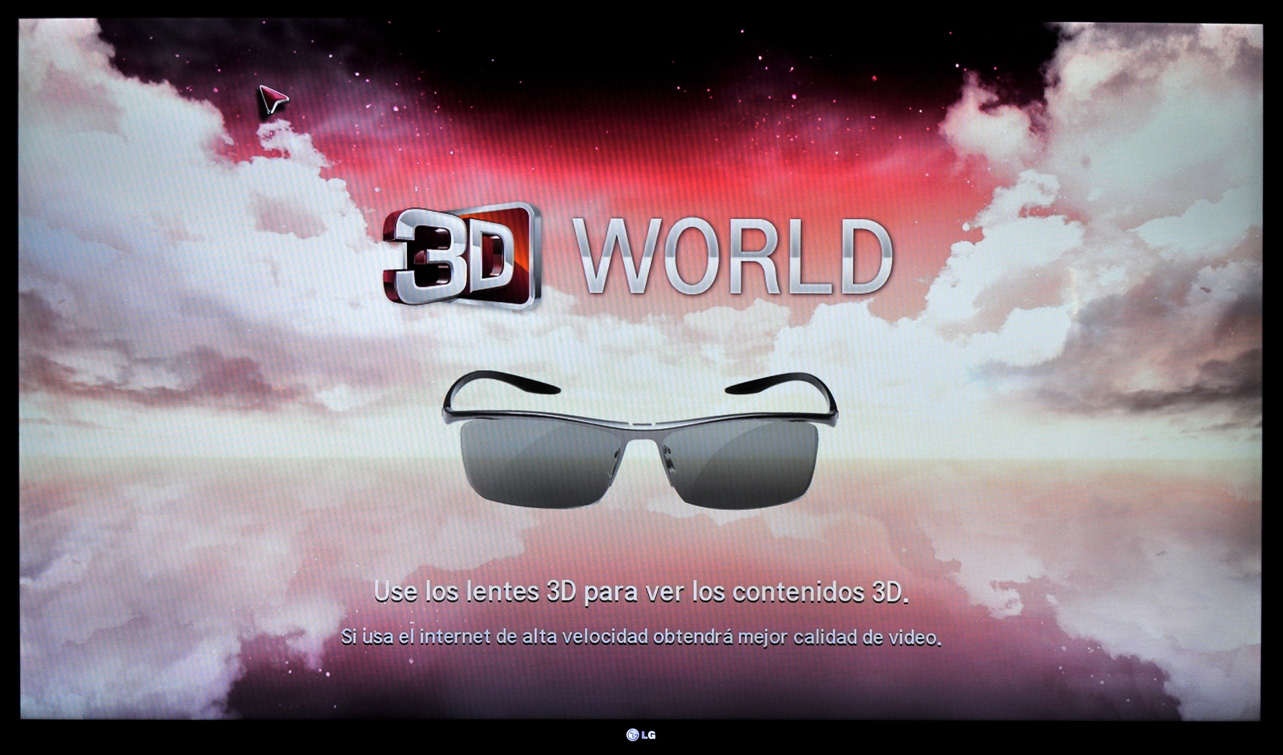 Para acceder a LG Smart TV basta con pulsar el botón 'Home' del mando a distancia, que nos lleva a la plantalla principal. Esta pantalla muestra, en la parte izquierda, la entrada de vídeo que se está reproduciendo. A la derecha encontramos varios bloques de cuadrículas 3×3 con iconos en su interior que dan acceso a cinco secciones: Premium, Smart Share, 3D World, LG Smart World y Game World.
