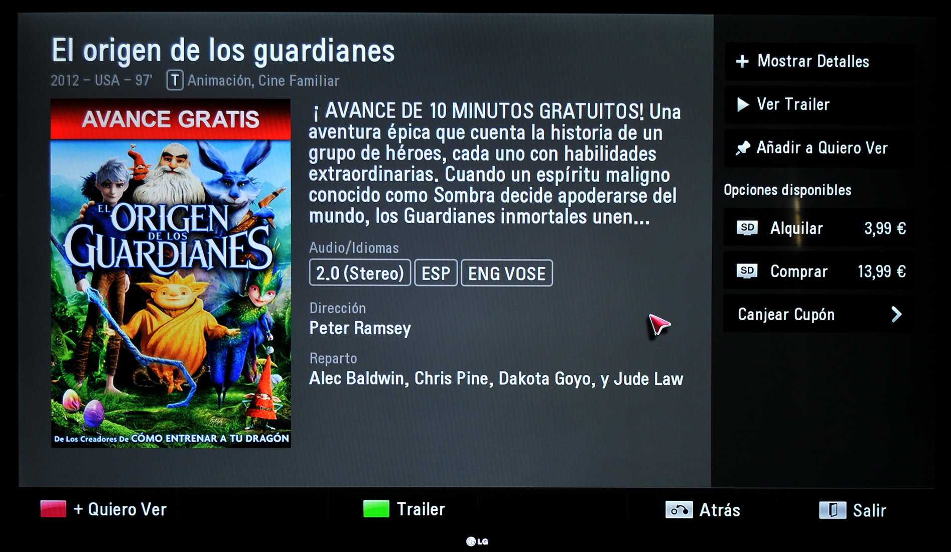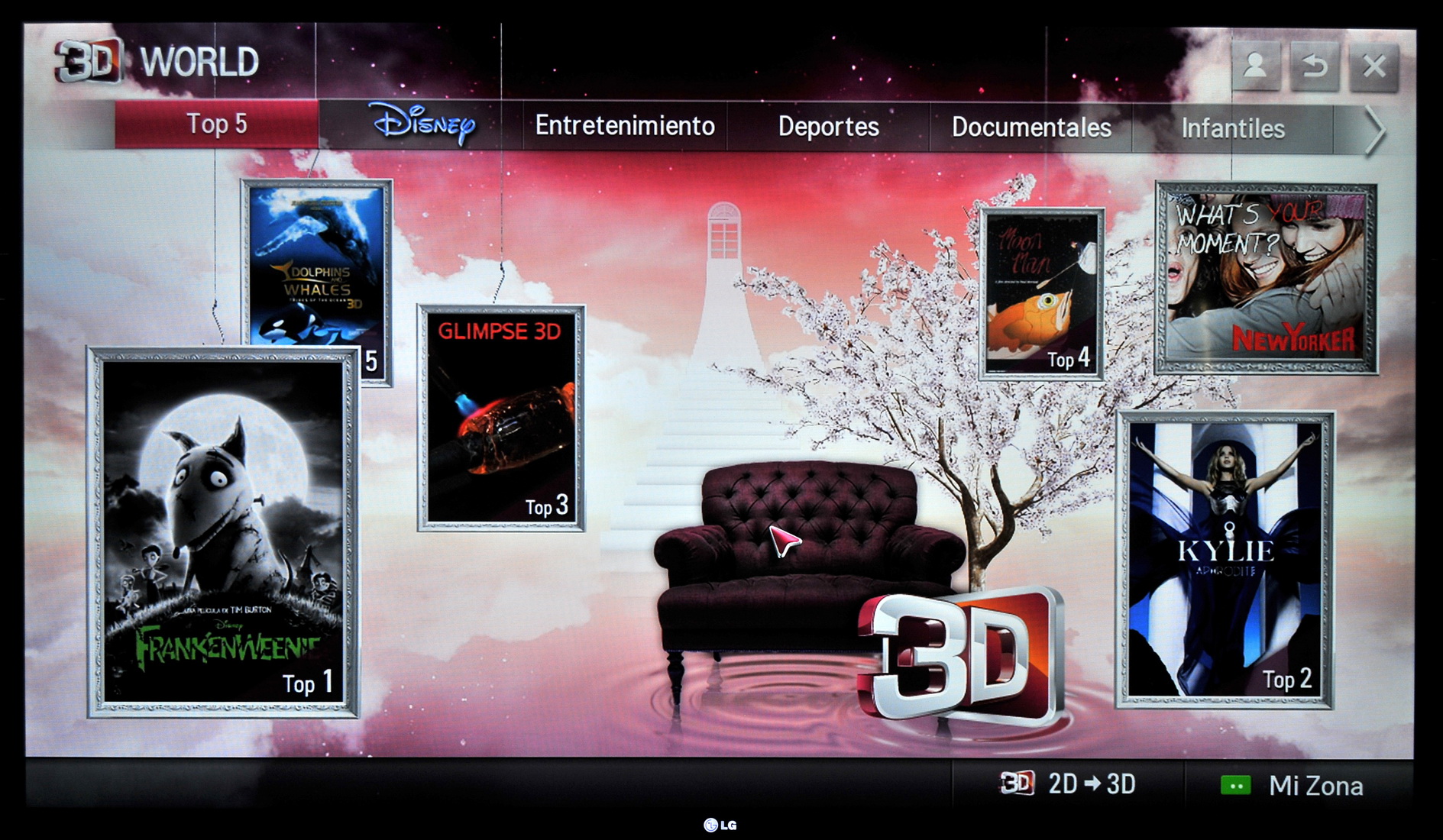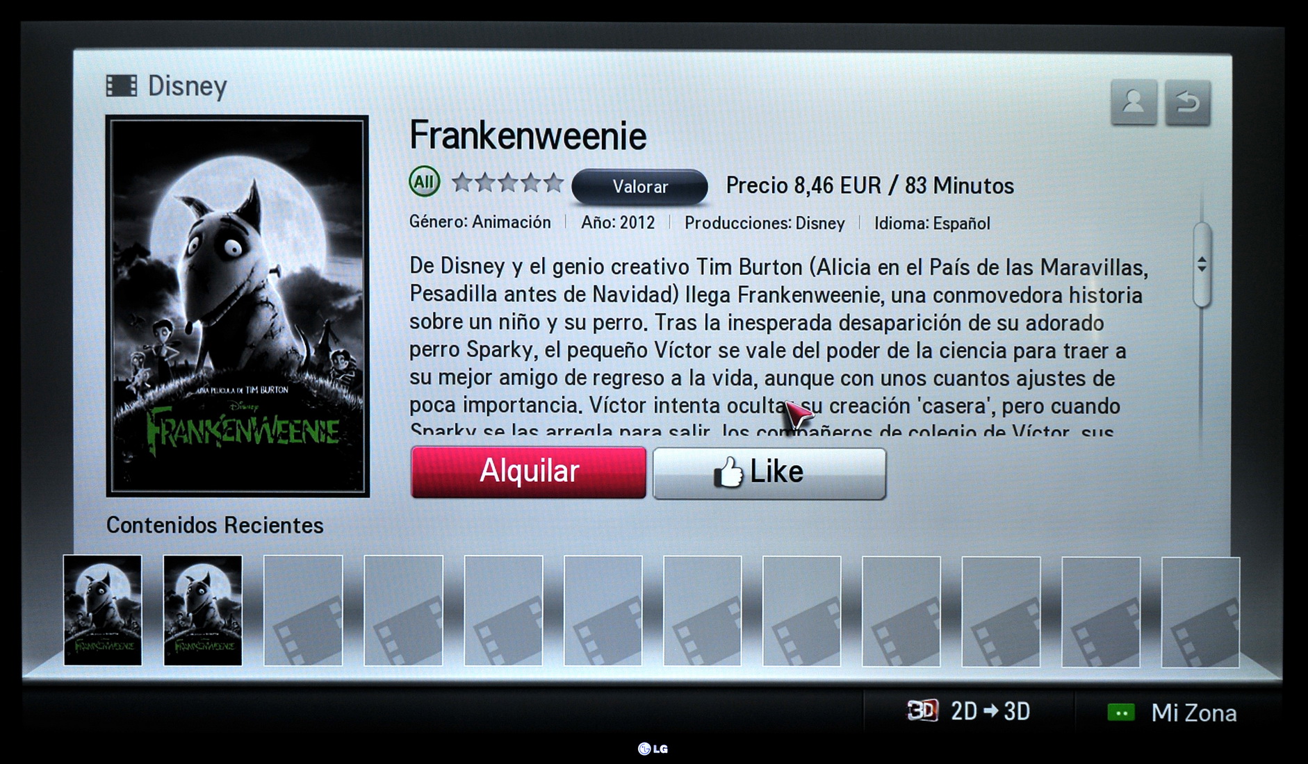 El apartado LG 3D World muestra un conjunto variado de contenidos 3D (películas, documentales, conciertos, etc.), algunos de ellos gratuitos y otros de pago. Por ejemplo, podemos alquilar la película Frankenweenie en 3D por 8,46 euros.