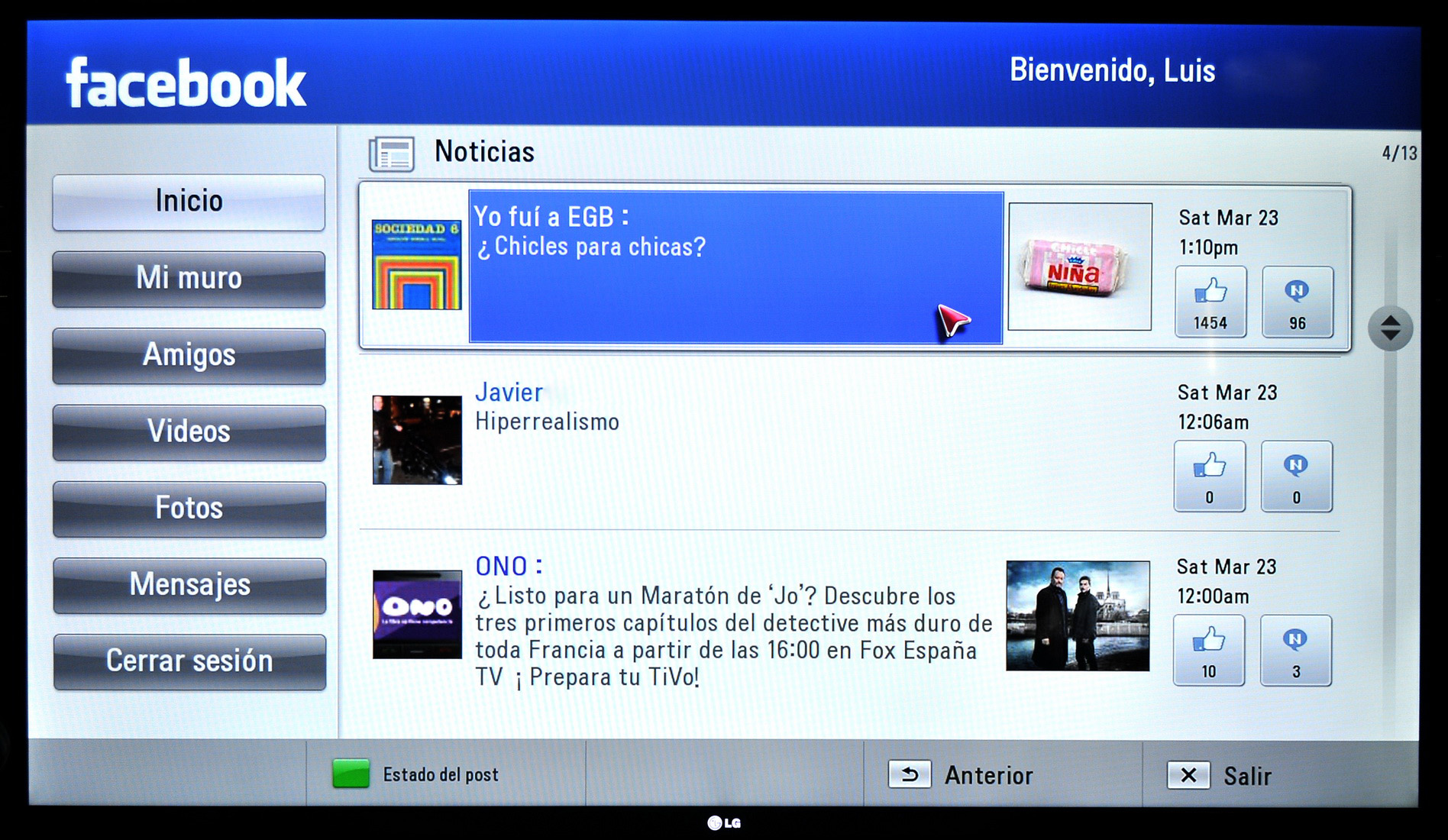 Por último encontramos Skype, que requiere la conexión de una cámara con micrófono LG AN-VC400 (EUR 92,20) para poder ser utilizada, y Facebook, que tiene un interfaz bastante sencillo con pocas opciones pero que cumple su cometido.