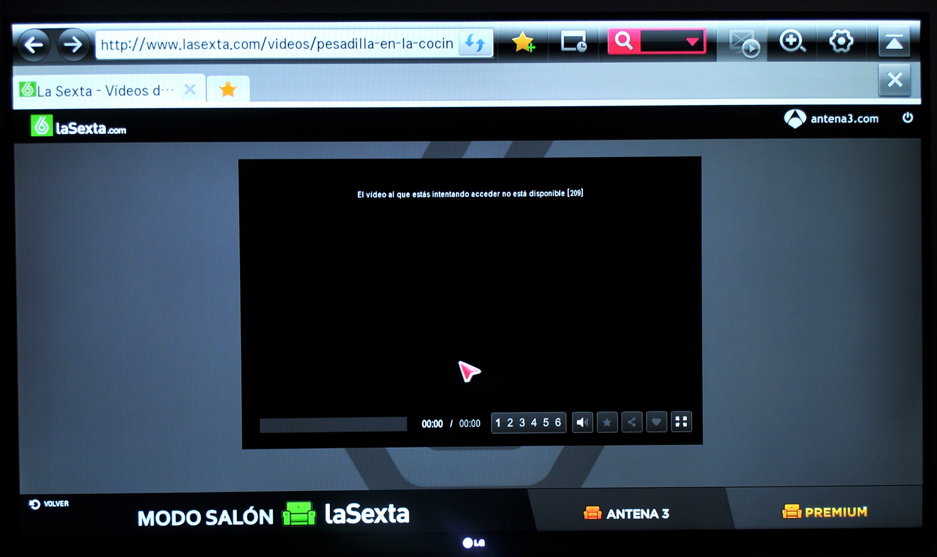 Otra prueba que hicimos fue visitar la web de );]La Sexta e intentar reproducir la televisión en directo o alguna de las grabaciones disponibles. Aunque fuimos capaces de ver el anuncio publicitario previo al inicio de la emisión sin problemas, los vídeos a los que queríamos acceder no se mostraron sino que la página web dio un mensaje de error que imaginamos que se debió a alguna incompatibilidad con el navegador.