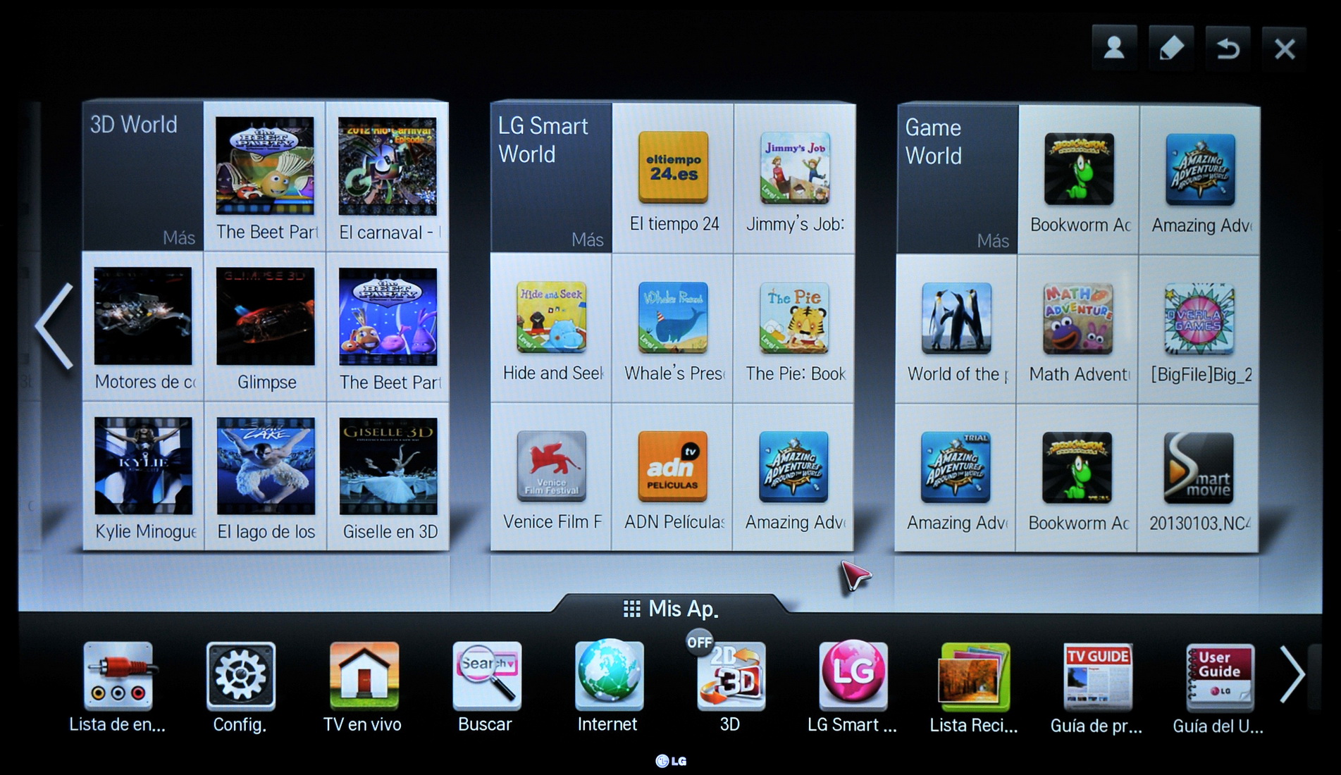 - Accesos directos a funciones de Smart TV: LG Smart World, Lista Recientes, 3D World, Vídeo, Foto, Música y Game World.