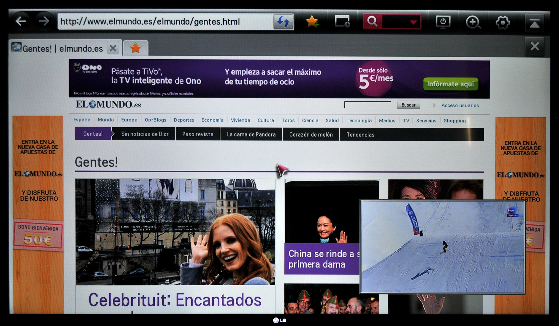 En la parte superior se pueden acceder a diversas opciones: añadir a favoritos, historial, búsqueda rápida (Google, Yahoo o Bing), televisión sobreimpresionada (PIP), zoom (75- 100- 125- 100- 200%) y opciones de configuración (borrar datos de historial y cookies, privacidad de las páginas visitadas, activación / desactivación de flash, configurar la ubicación del PIP, configurar la calida dde la imagen y codificación de texto).