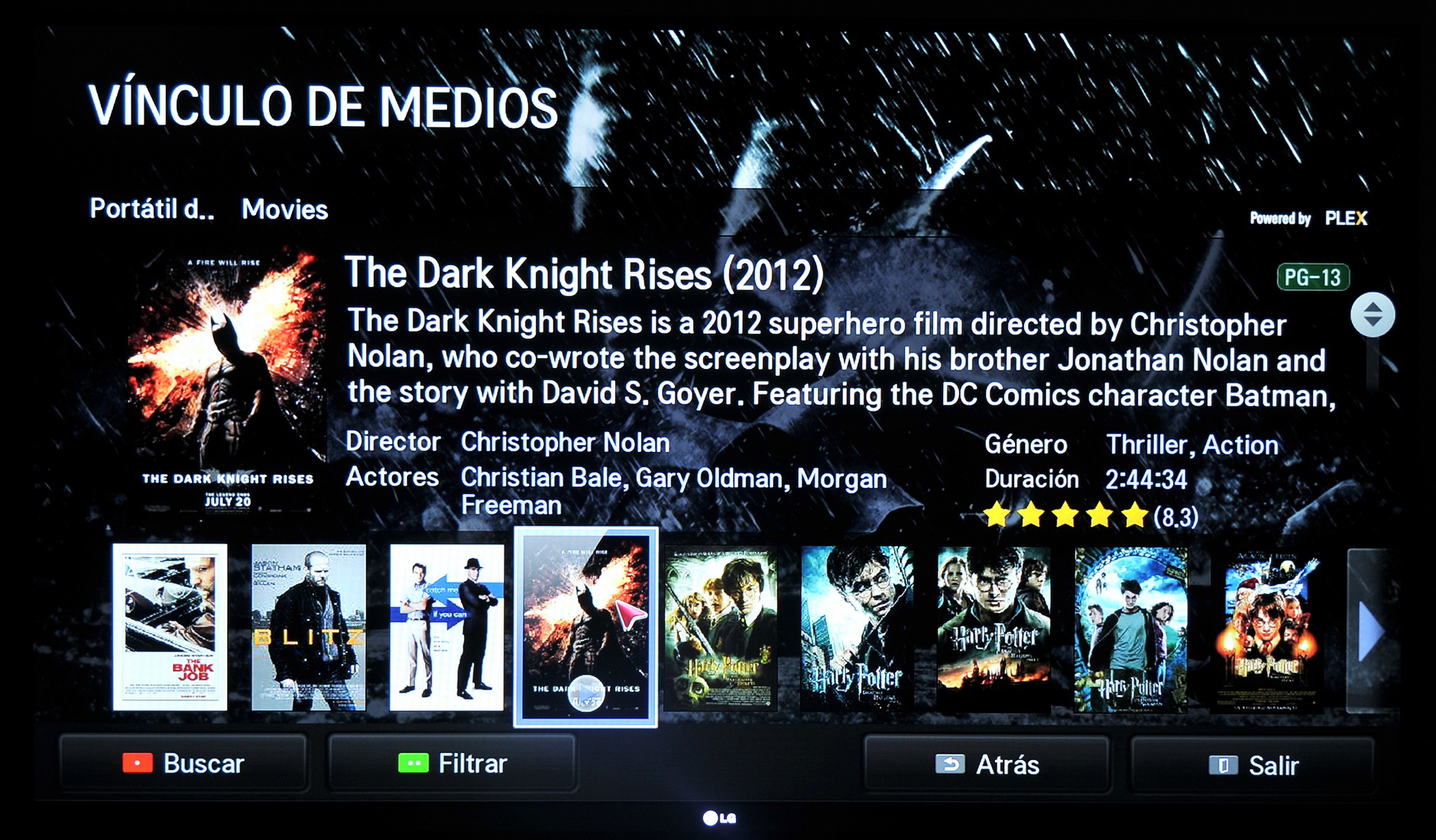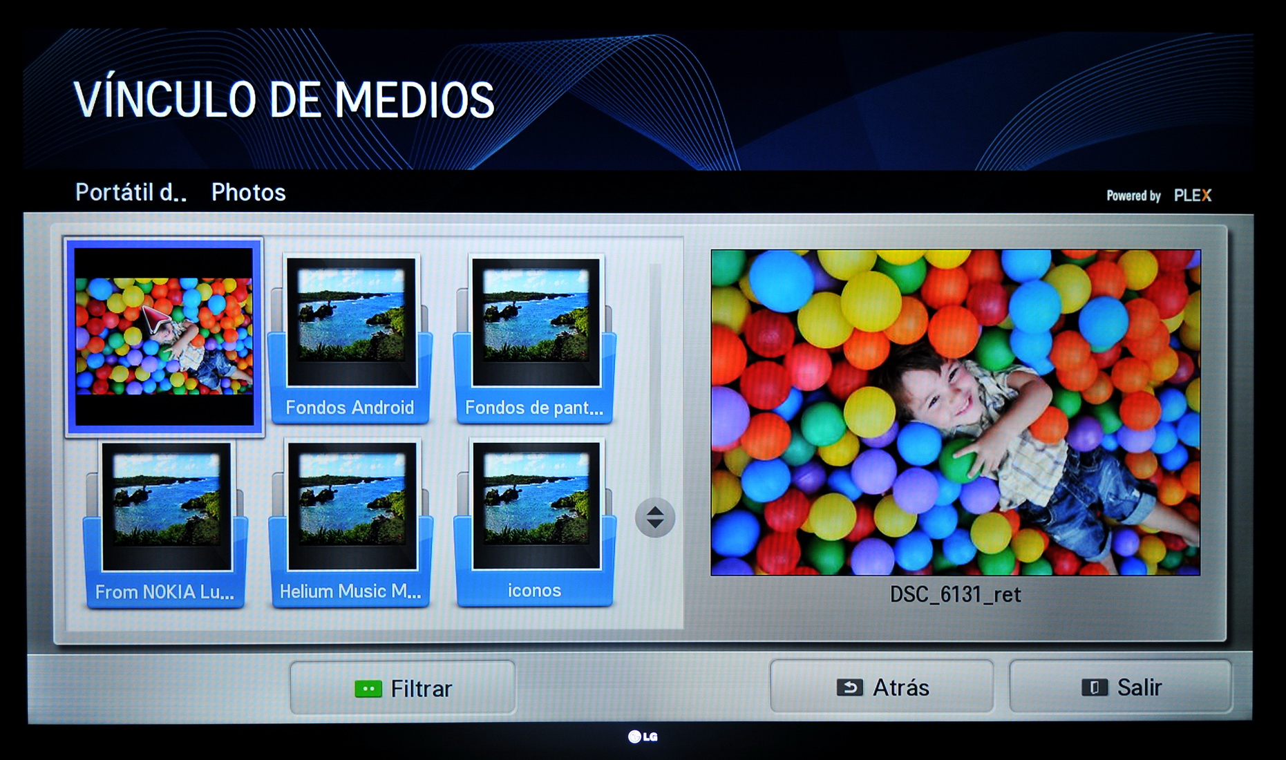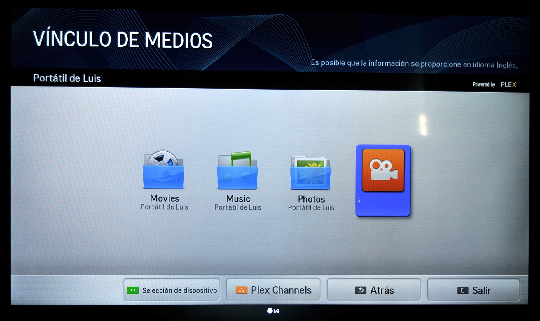 Vínculo de Medios (o Media Link en inglés, que suena mejor que la traducción escogida por LG) es una aplicación que permite acceder a contenido multimedia (películas, series de TV, música e imágenes) que esté almacenado en un PC. Para que funcione es necesario instalar en el PC un software grautito llamado Plex que actúa como servidor de medios y que organiza automáticamente el contenido tras descargar información de Internet (carátula, intérpretes, información adicional, etc.).