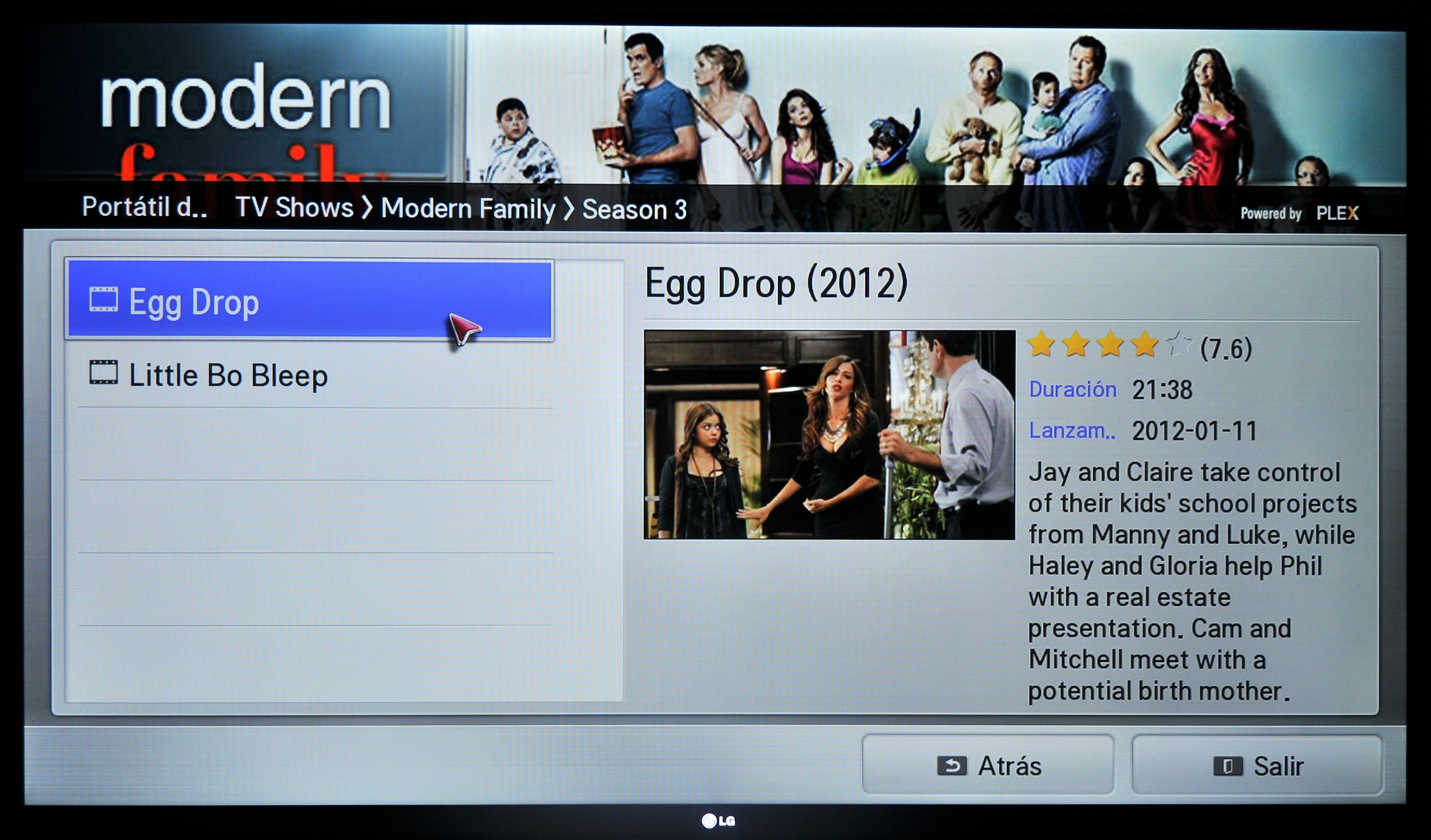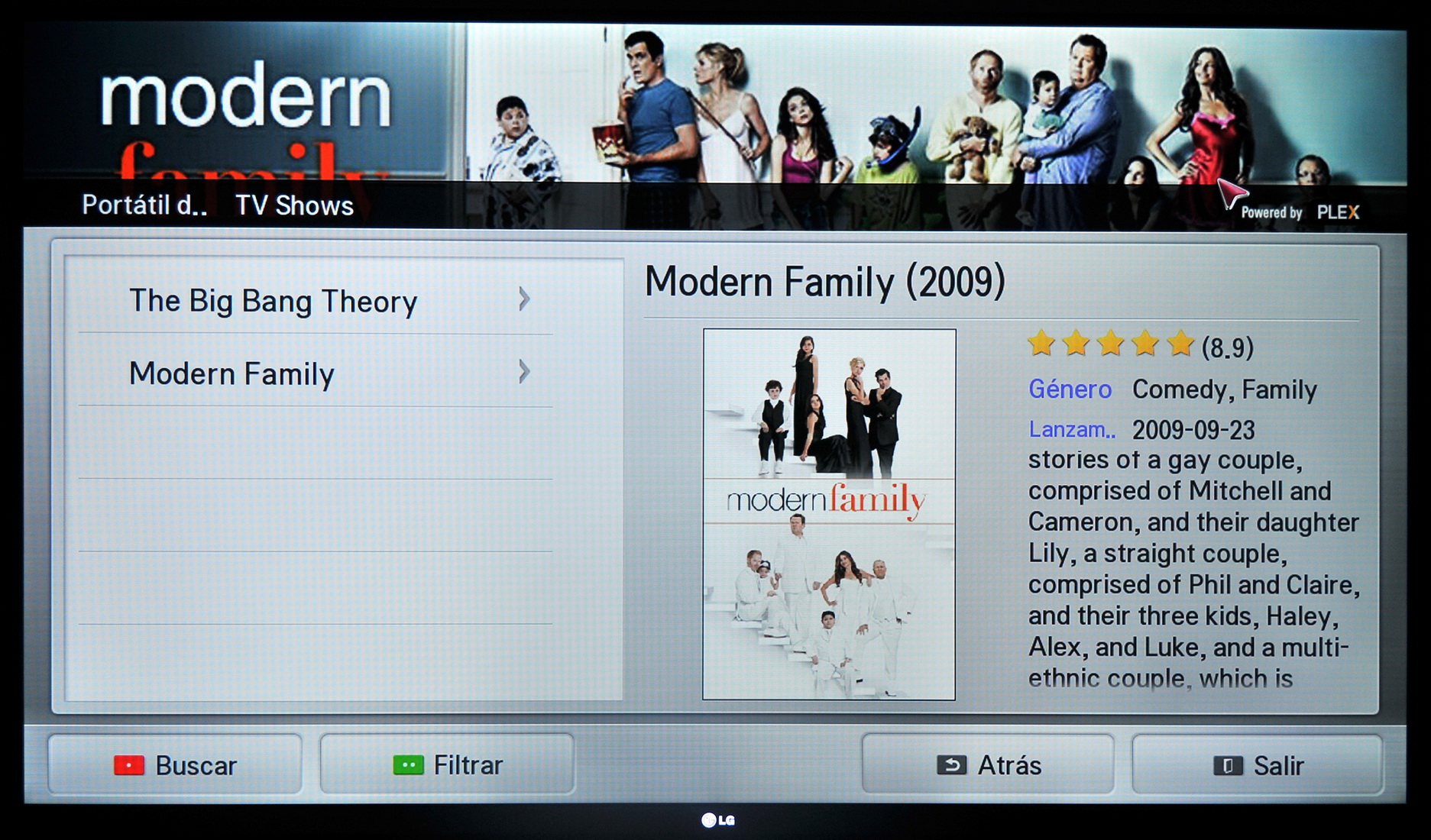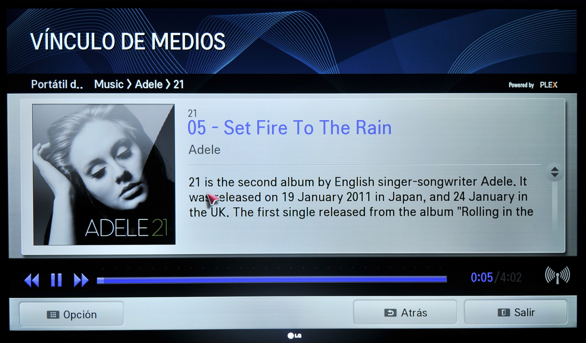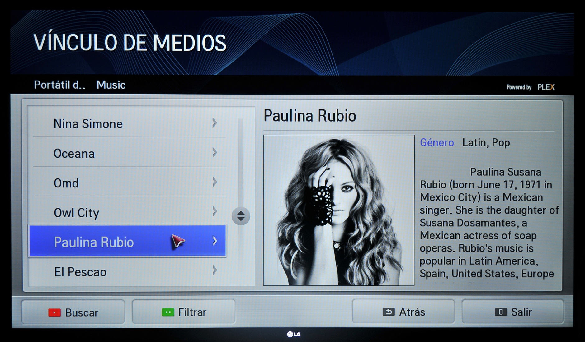 Vínculo de Medios (o Media Link en inglés, que suena mejor que la traducción escogida por LG) es una aplicación que permite acceder a contenido multimedia (películas, series de TV, música e imágenes) que esté almacenado en un PC. Para que funcione es necesario instalar en el PC un software grautito llamado Plex que actúa como servidor de medios y que organiza automáticamente el contenido tras descargar información de Internet (carátula, intérpretes, información adicional, etc.).