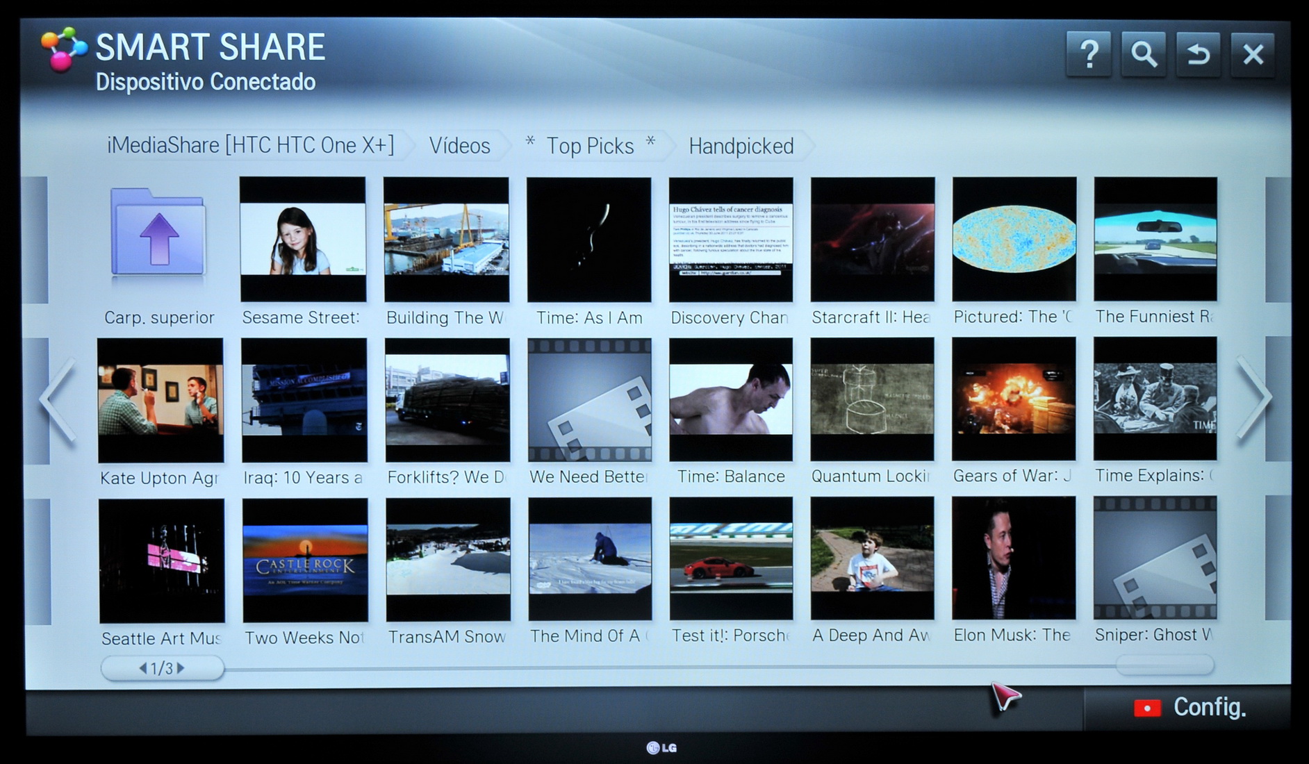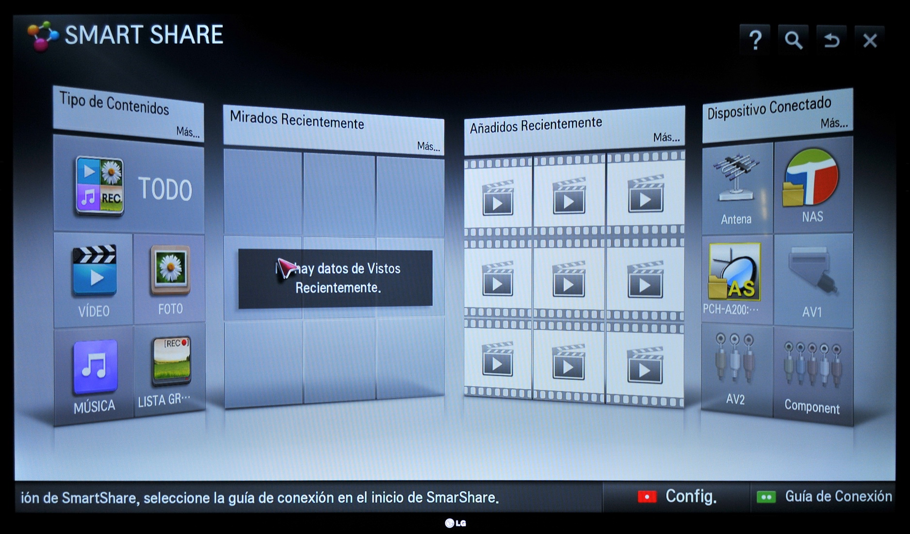 La sección de Smart Share es una de las que más nos ha gustado ya que, de forma sencilla, podemos acceder a todas fuentes de contenido que pueden ser reproducidas en el televisor: cadenas de televisión que llegan por la antena convencional, dispositivos de vídeo conectados por alguna entrada del televisor (HDMI, Componentes, etc.) o servidores multimedia conectados a la misma red local.