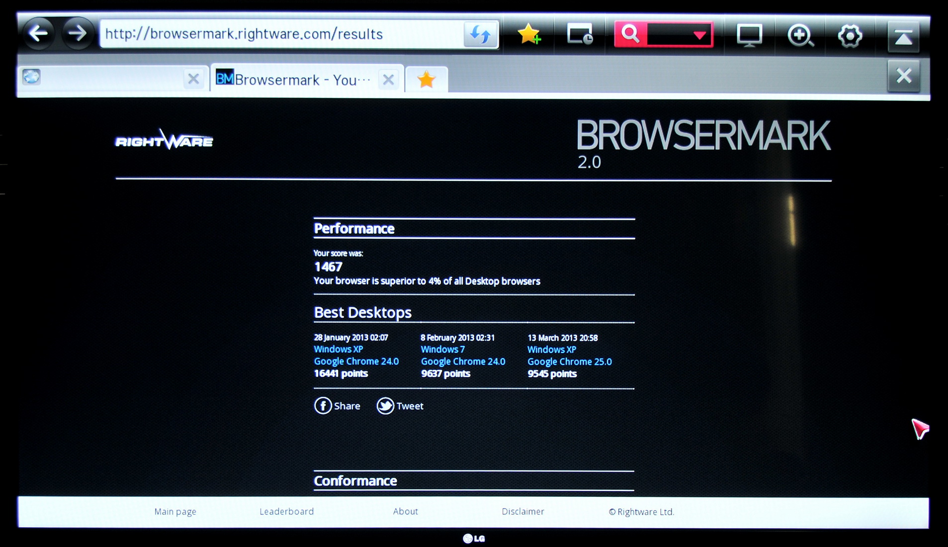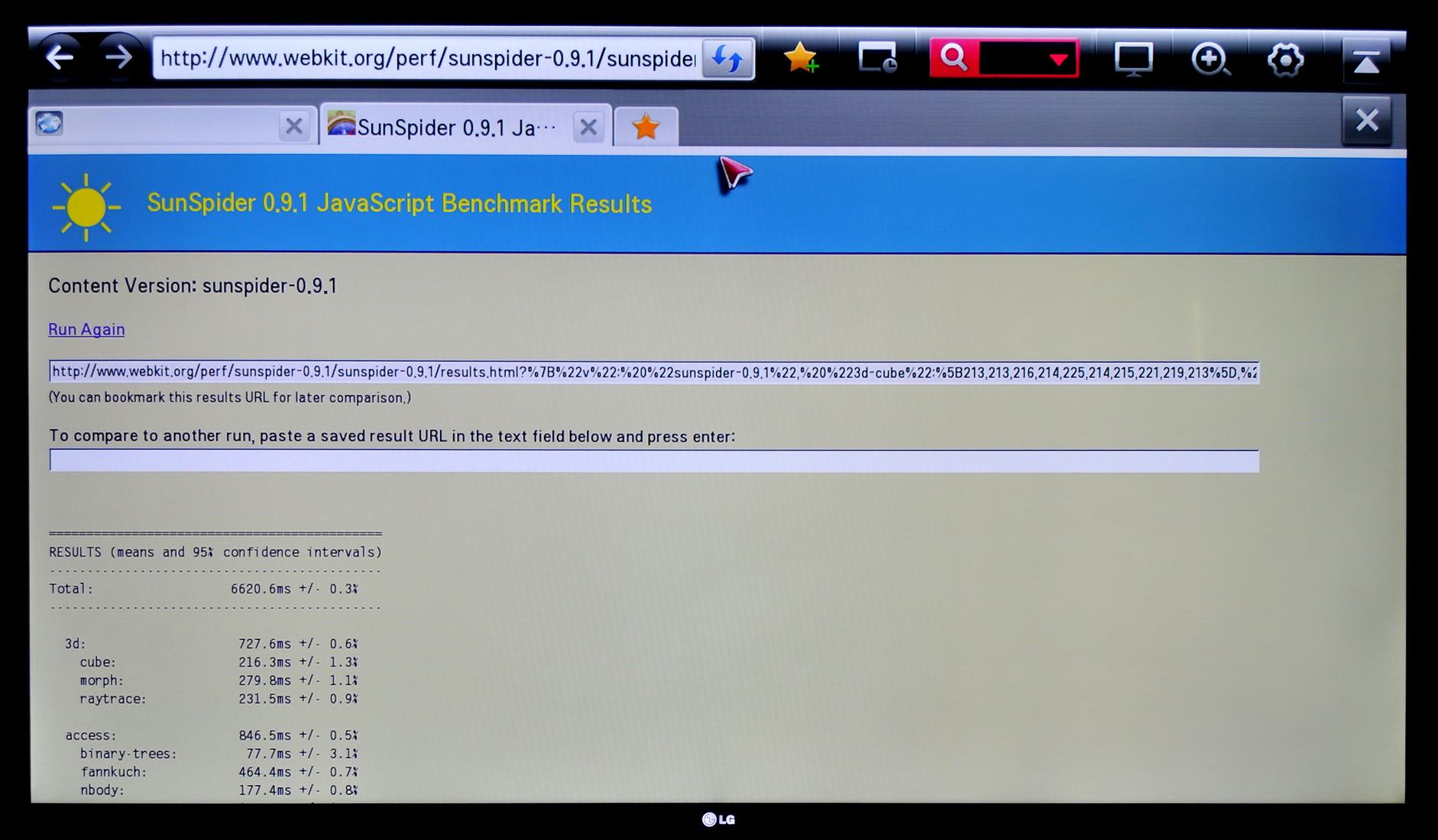 El benchmark de Javascript del navegador, Sunspider, ha dado 6620 ms. y BrowserMark 2.0 ha entregado 1467 puntos. Si comparamos estos resultados con los que obtiene un PC, tablet o móvil actual resultan ser bastante pobres, pero es suficiente para poder navegar.