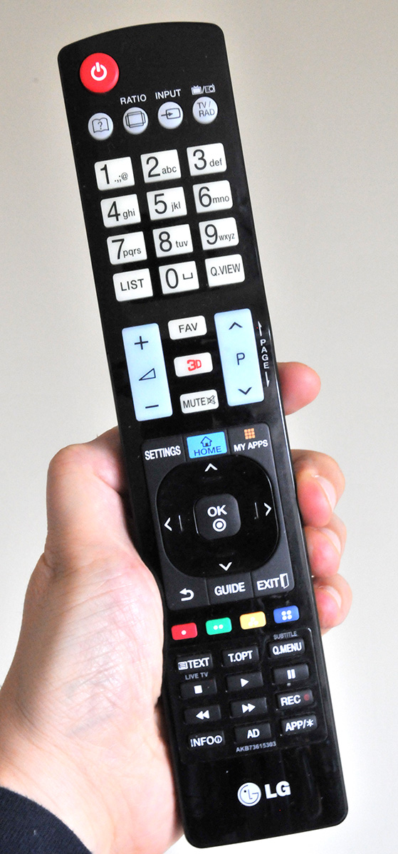 La televisión que hemos probado, LG 55LM860V, incorpora dos mandos a distancia: uno rectangular convencional y otro con muchos menos botones que LG denomina Control Magic (ver foto más abajo).