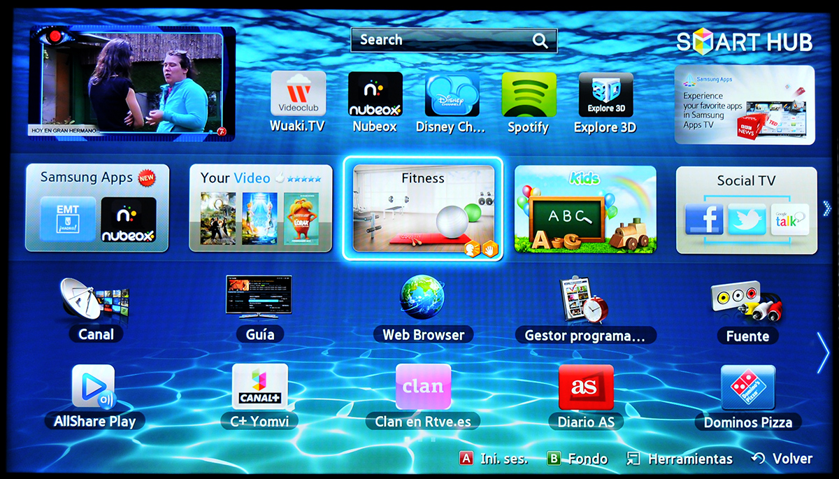 - La zona central contiene seis cajas que dan acceso a aplicaciones o, en algunos casos, grupos de aplicaciones destacadas: Samsung Apps, Your Video, Fitness, Kids, Social TV y Family Story.