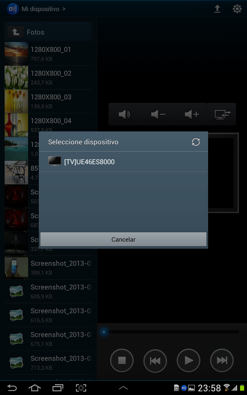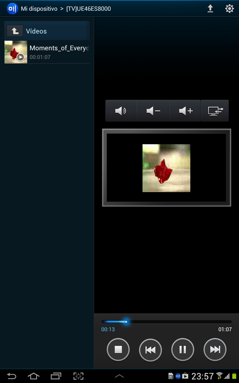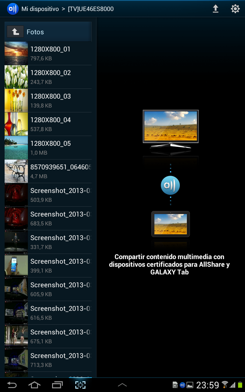En nuestras pruebas con los teléfonos HTC One X+ y LG Optimus L9, y con el tablet Samsung Galaxy Tab 2 10.1" fue posible enviar directamente contenidos desde el LG Optimus L9 (a través de la aplicación LG SmartShare) y desde el tablet Samsung Galaxy Tab 2 (a través de la aplicación AllShare). A continuación incluimos algunas capturas de pantalla del tablet Samsung con la aplicación AllShare.