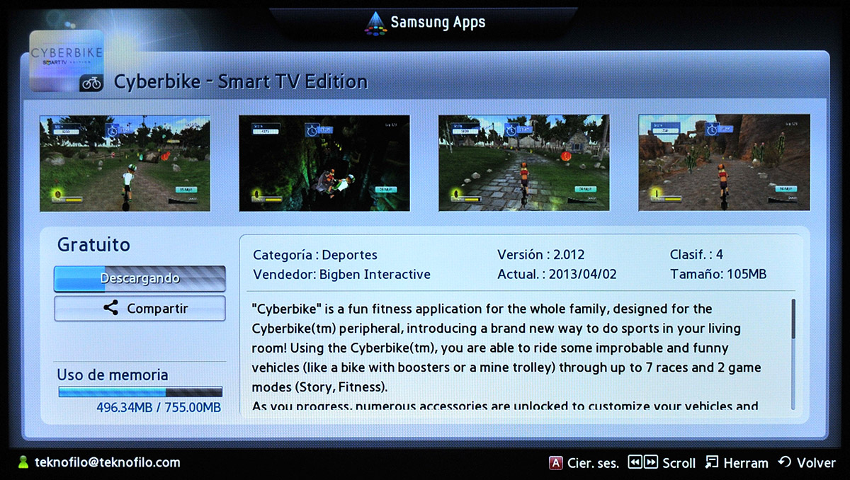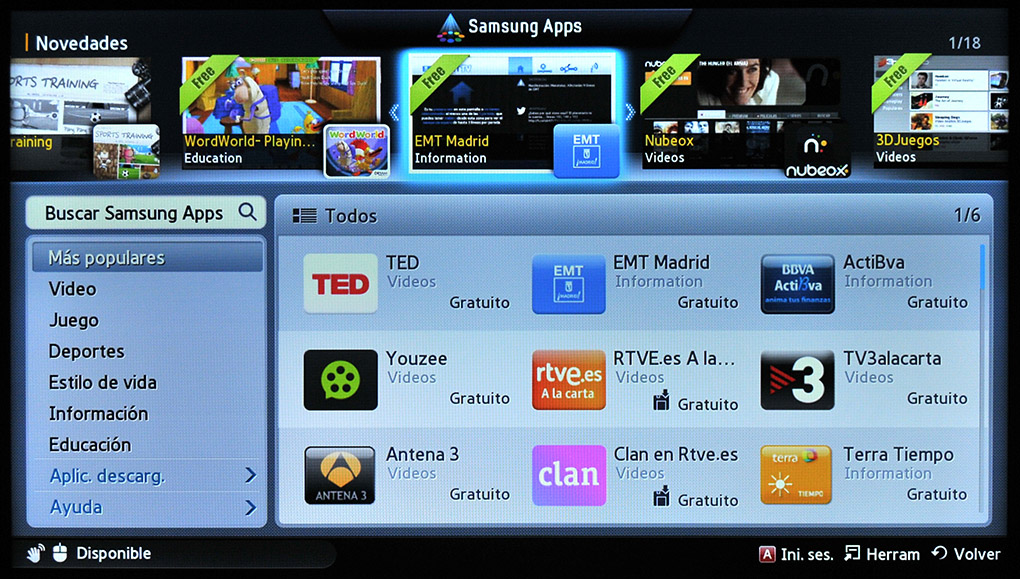 Por medio de Samsung Apps podemos acceder al mercado de aplicaciones y juegos de Samsung para descargar este tipo de contenido en la televisión. El catálogo está organizado en varios secciones: Más populares, Vídeo, Juego, Deportes, Estilo de Vida, Información y Educación.