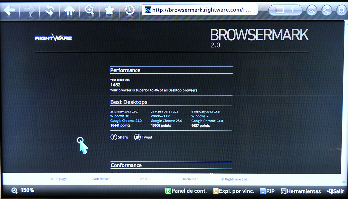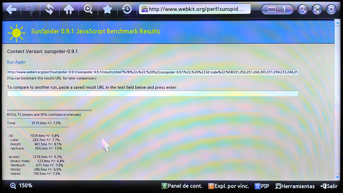 Sunspider, el famoso benchmark de Javascript para navegadores, ha dado como resultado 9175 ms. y el test BrowserMark 2.0 ha entregado 1.452 puntos. Si comparamos estos resultados con los que obtiene un PC, tablet o móvil actual resultan ser pobres, pero es suficiente para poder navegar por webs complejas.