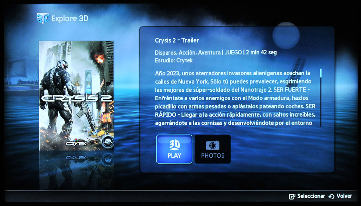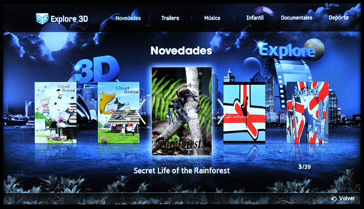 La aplicación Explore 3D ofrece acceso gratuito a vídeos en 3D de distintos tipos - trailers, música, infantil, documentales y deportes - que se pueden ver en streaming. Merece la pena destacar los trailers, ya que son de películas y juegos de ordenador muy actuales.