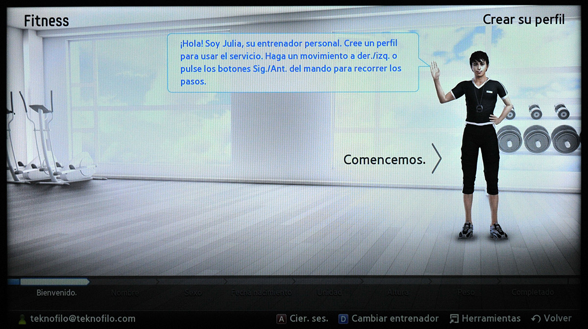 Otra de las aplicaciones estrella de la plataforma Smart TV de Samsung es Fitness, un completo sistema de entrenamiento personal para ponerse en forma. La aplicación comienza solicitando datos físicos (altura, peso, edad, etc.) y, a partir de ahí, determina el índice de masa corporal y propone ejercicios. Incluye todo un sistema de seguimiento para que puedas ir monitorizando el peso que vas perdiendo (o ganando) al cabo de las semanas.