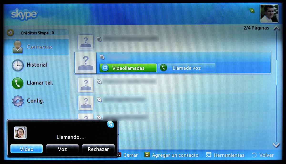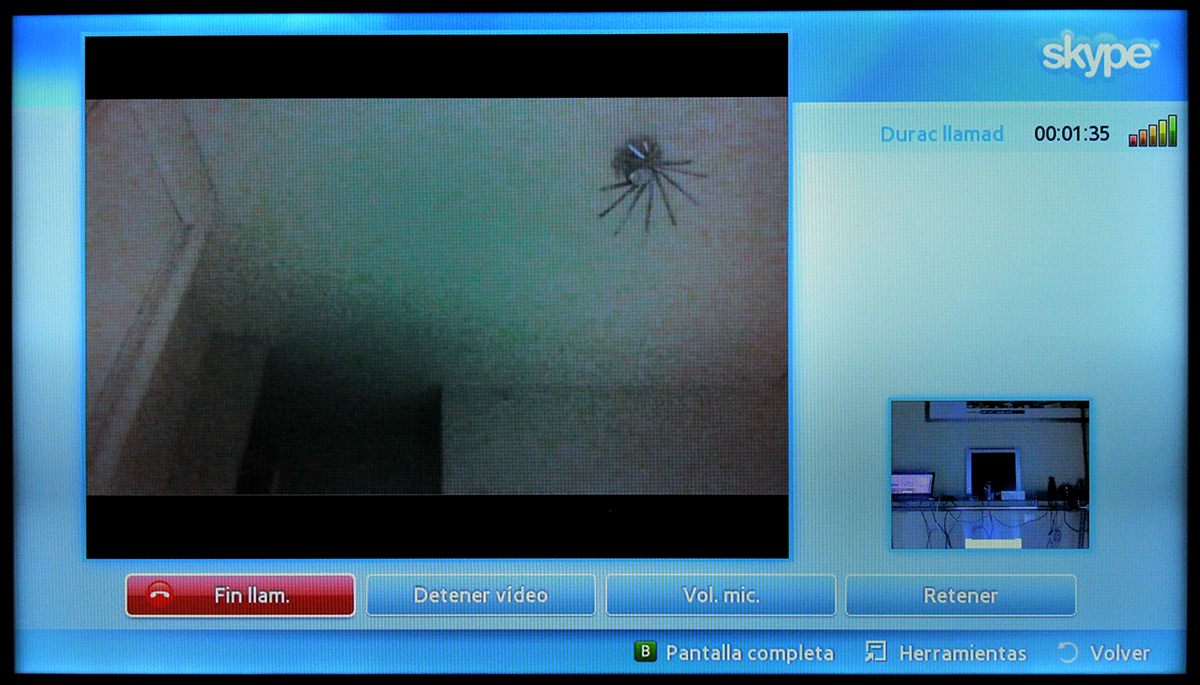 La aplicación Skype permite realizar videoconferencias con nuestros contactos y, al disponer el televisor que hemos probado de cámara y micrófono integrado, no es necesario ningún accesorio. Es posible dejar la aplicación corriendo en segundo plano, de forma que podemos estar viendo la televisión y la aplicación nos avisa si recibimos una llamada.