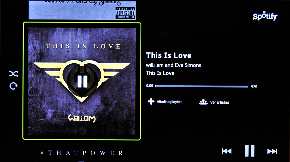 Con la compra del televisor se incluye una prueba gratuita de 30 días del servicio Spotify premium, que elimina algunas limitaciones del servicio gratuito.
