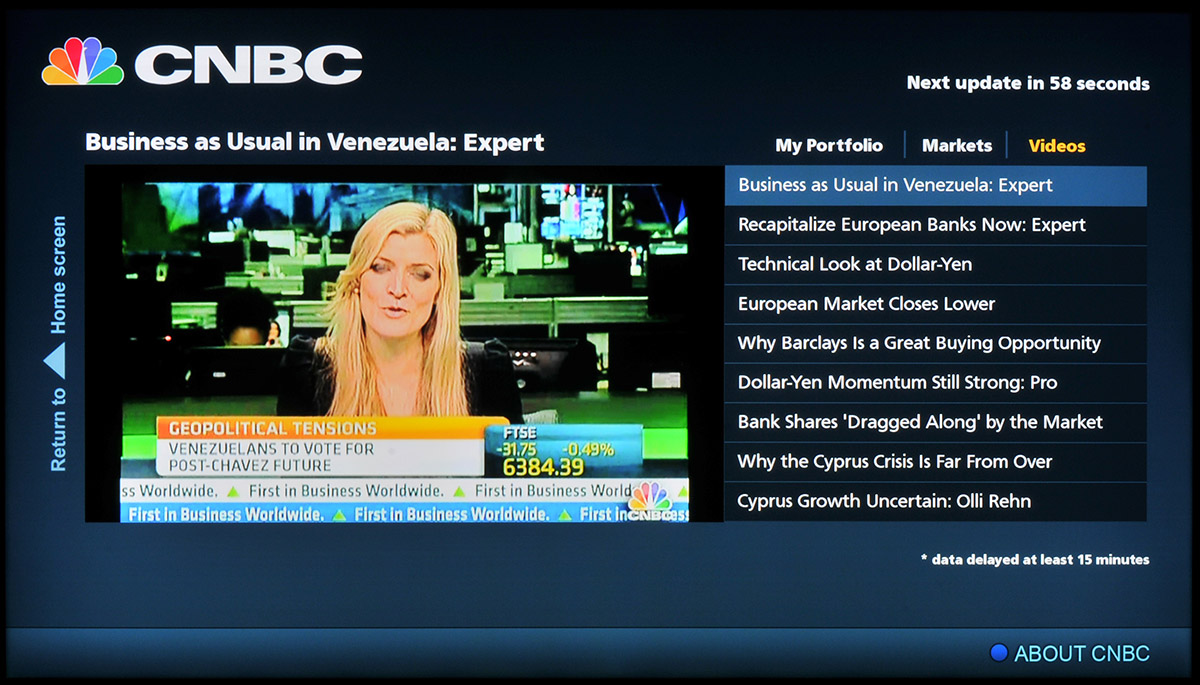 Las aplicaciones CNBC y Eurosport permiten acceder a vídeos sobre noticias de ámbito general y de deportes respectivamente. Adicionalmente Panasonic ha incluido la aplicación Eurosport Player que permite visualizar eventos de deportes en directo pagando una suscripción.