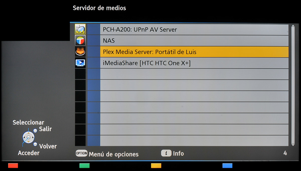 En nuestro caso el televisor detectó automáticamente cuatro servidores multimedia conectados a la red Wi-Fi – el reproductor multimedia PopcornHour A-200 (PCH-A200), una NAS de Zyxel (NAS), un portátil corriendo un servidor de medios (Plex Media Server) y un teléfono móvil HTC One X+ corriendo el software iMediaShare Lite – tal y como se puede apreciar en la siguiente imagen.