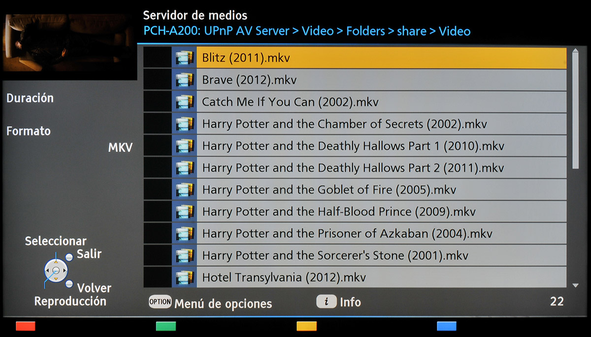 Al pulsar sobre cualquiera de los iconos se abre un visor de carpetas que nos permite ir navegando por los contenidos almacenados en estos dispositivos. En la imagen de abajo se puede ver el resultado de explorar el PopcornHour A-200, que almacena varias películas.