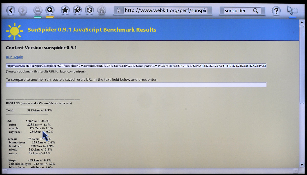 Sunspider, el famoso benchmark de Javascript para navegadores, ha dado como resultado 5116 ms. y el test BrowserMark 2.0 ha entregado 1.286 puntos. Si comparamos estos resultados con los que obtiene un PC, tablet o móvil actual resultan ser pobres, pero es suficiente para poder navegar por webs complejas.