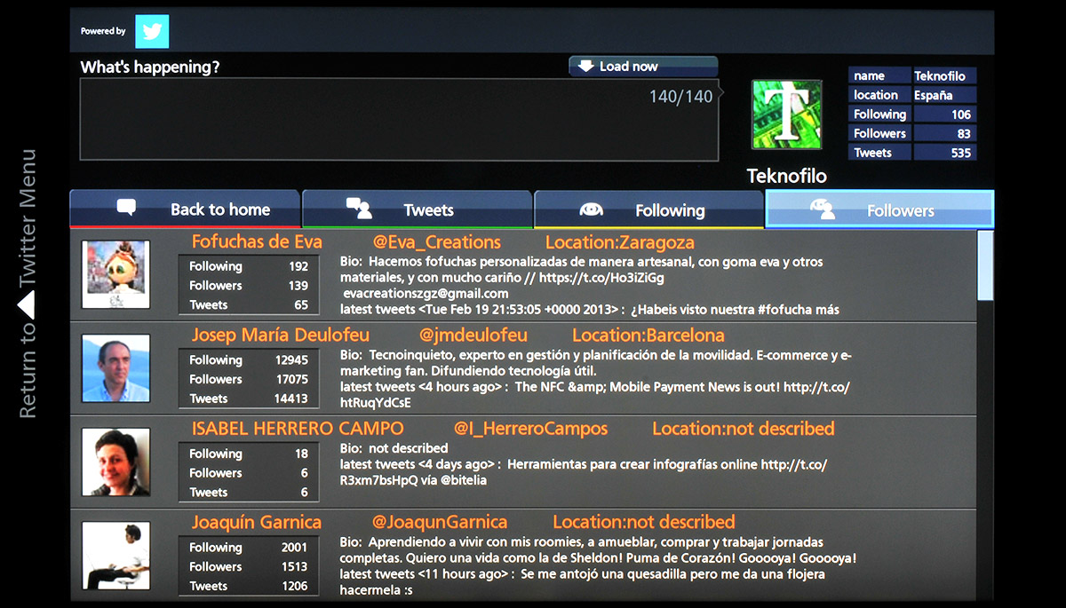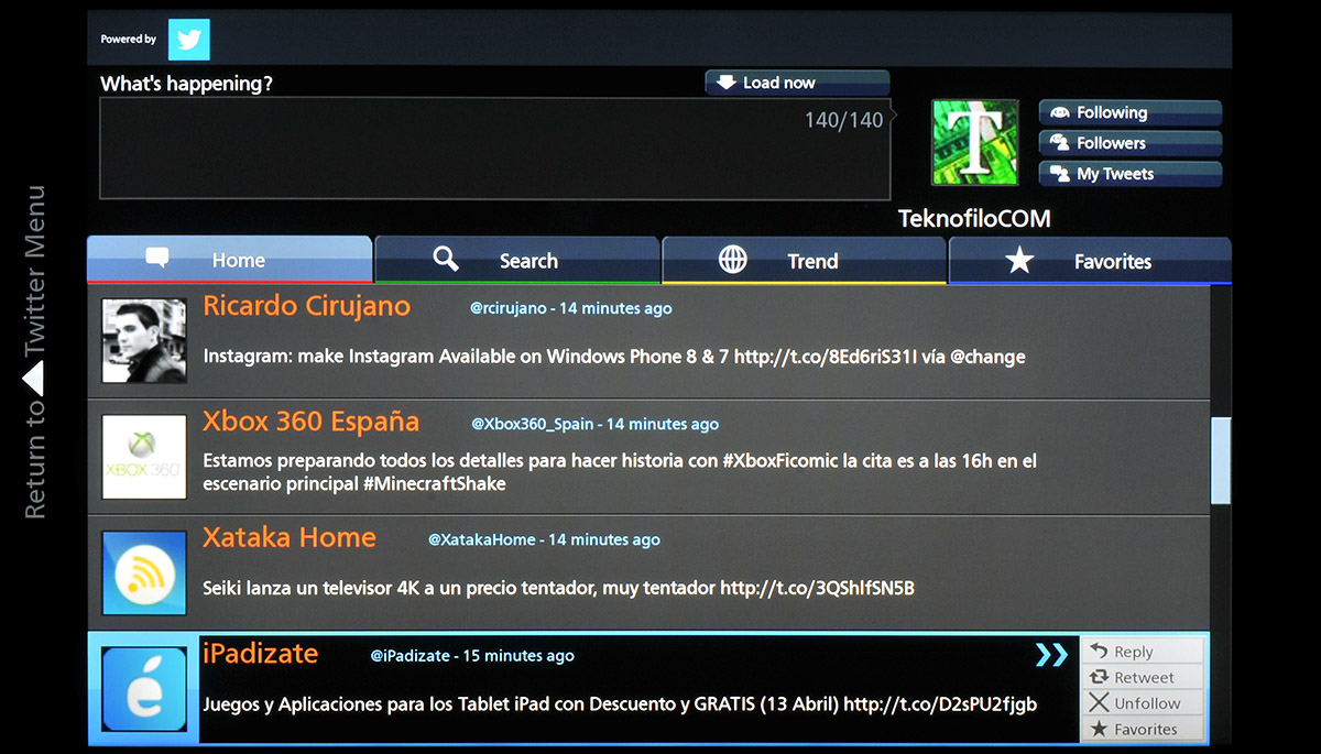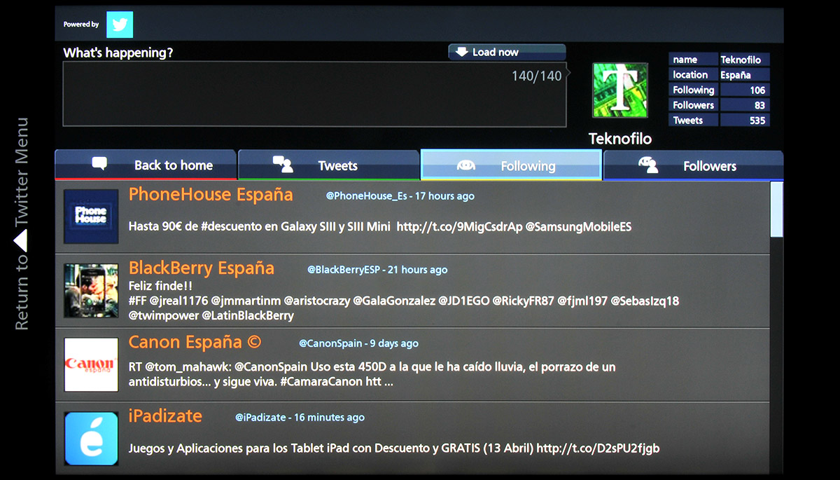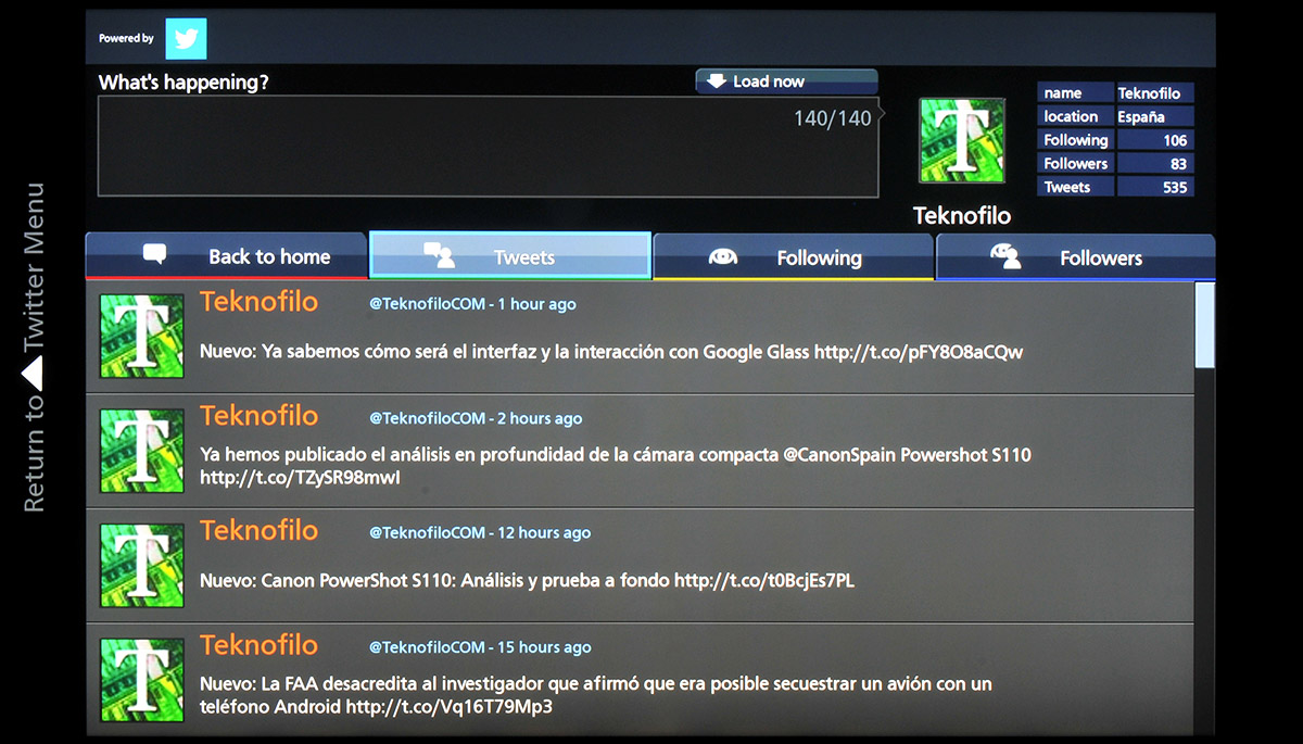 La idea es interesante, especialmente para Twitter ahora se ha popularizado el uso de un hashtag para hacer comentarios sobre un programa de televisión. A diferencia de otras aplicaciones sociales de televisión, la de Panasonic permite filtrar los tweets para que sólo se muestren los que contengan un hashtag en particular, y estos se van a actualizando en la pantalla. Sin embargo no se puede definir un hashtag para que se añada automáticamente a cada tweet escrito durante el transcurso de un programa de televisión.