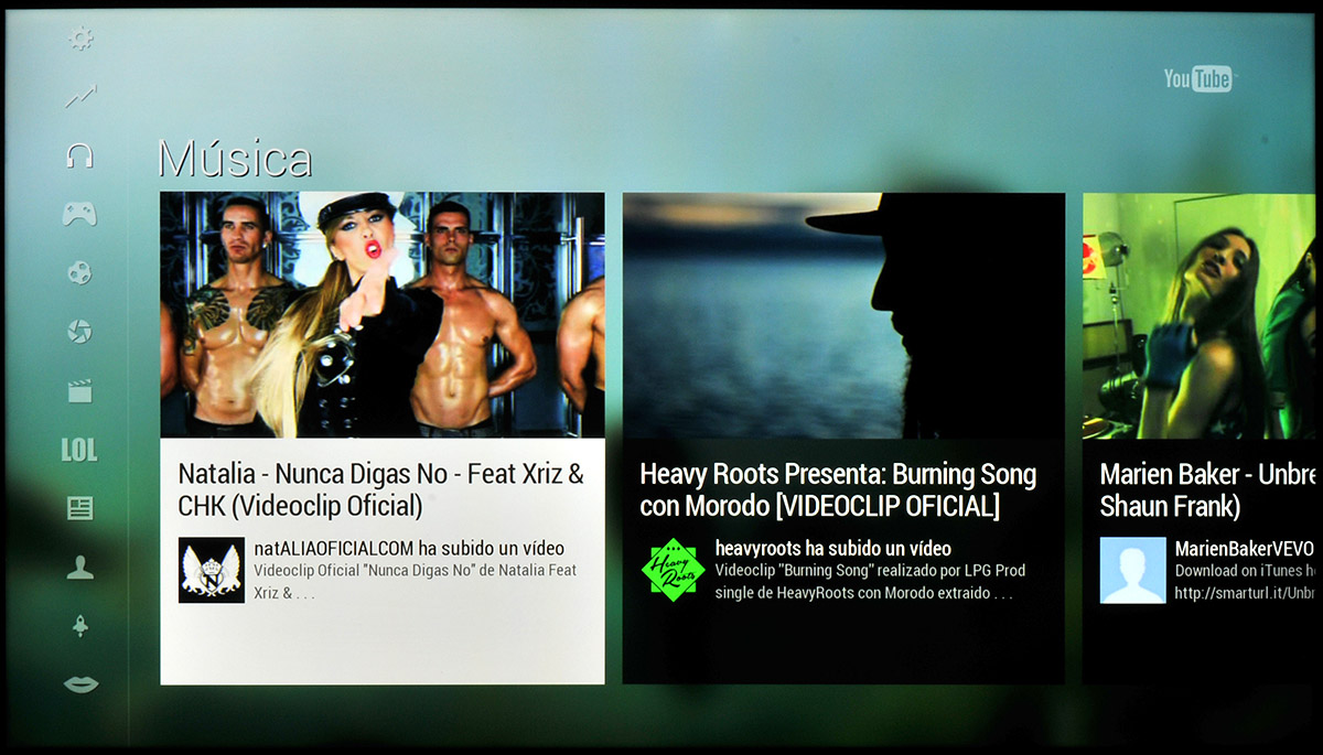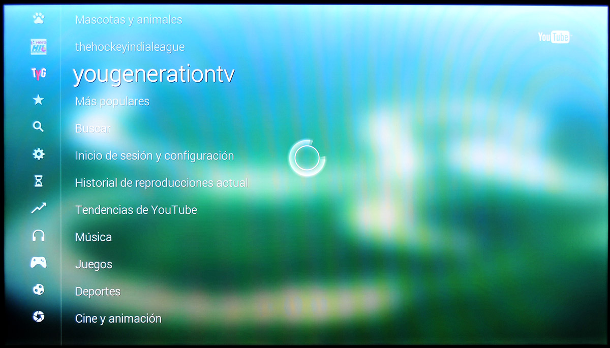 En la parte izquierda encontramos iconos que nos dan acceso a opciones, tendencias, búsquedas, historial y a diferentes categorías de vídeos: música, juegos, deportes, cines y animación, entretenimiento, comedia, noticias y política, gente y blogs, ciencia y tecnología, consejos y estilo, formación, y mascotas y animales.